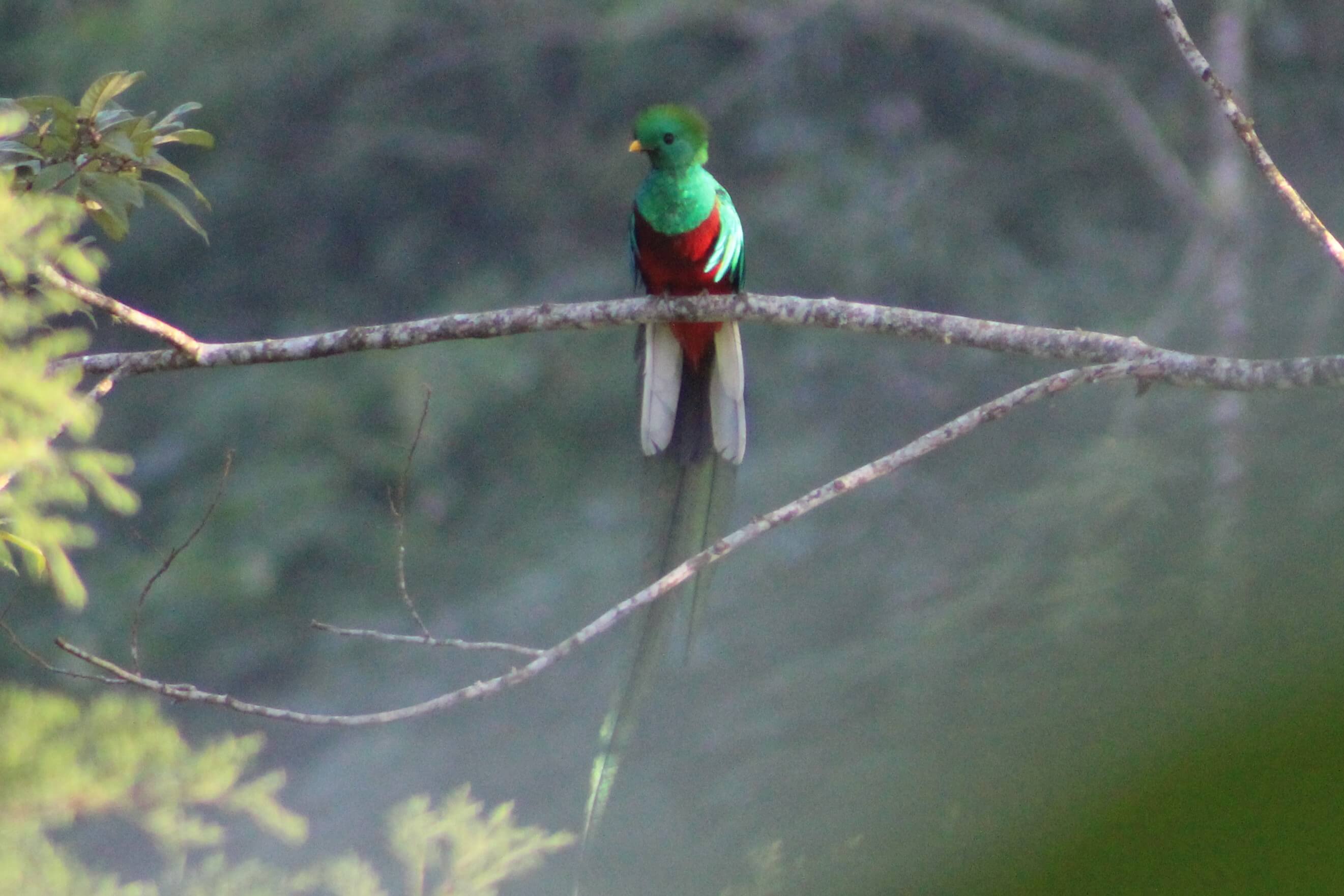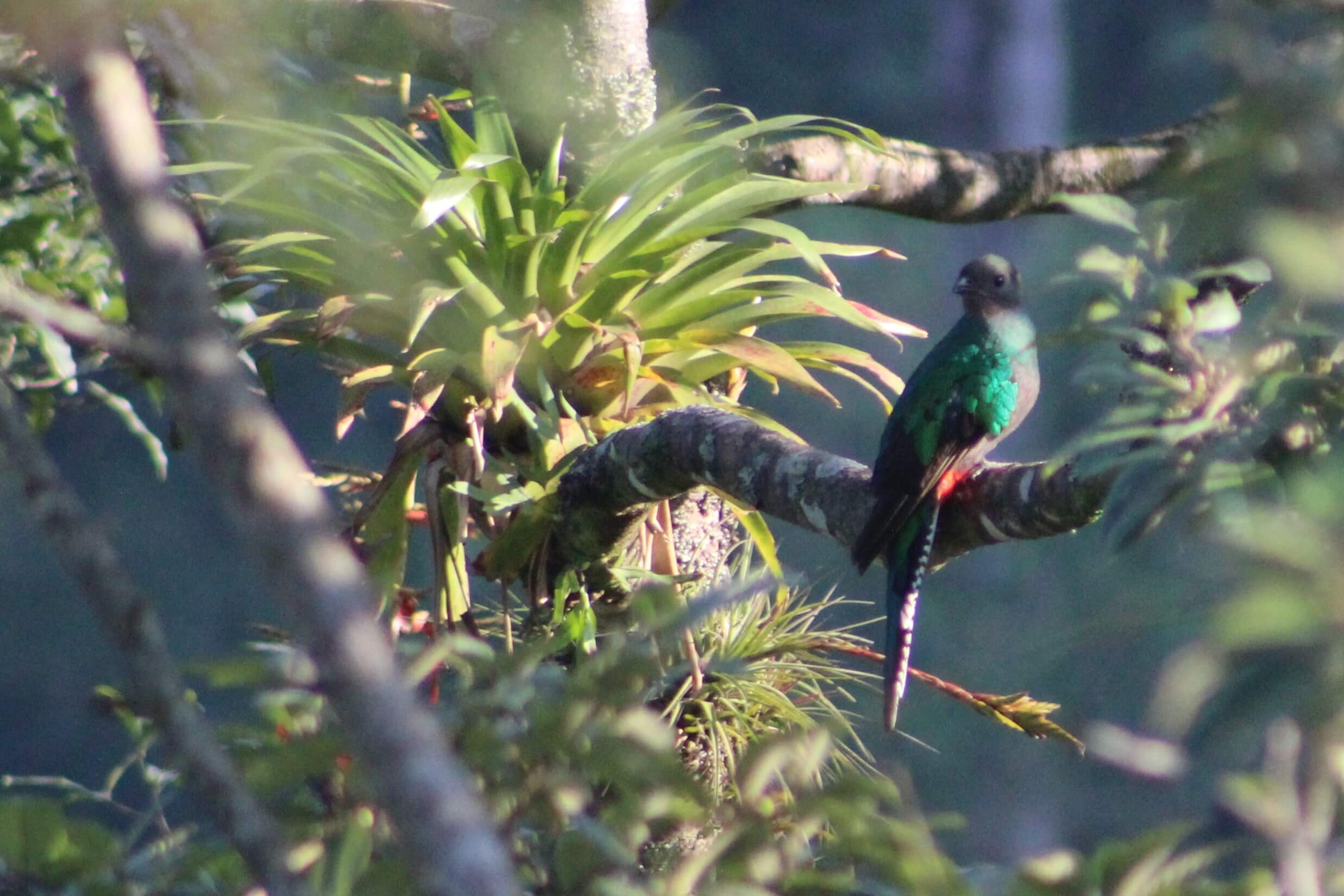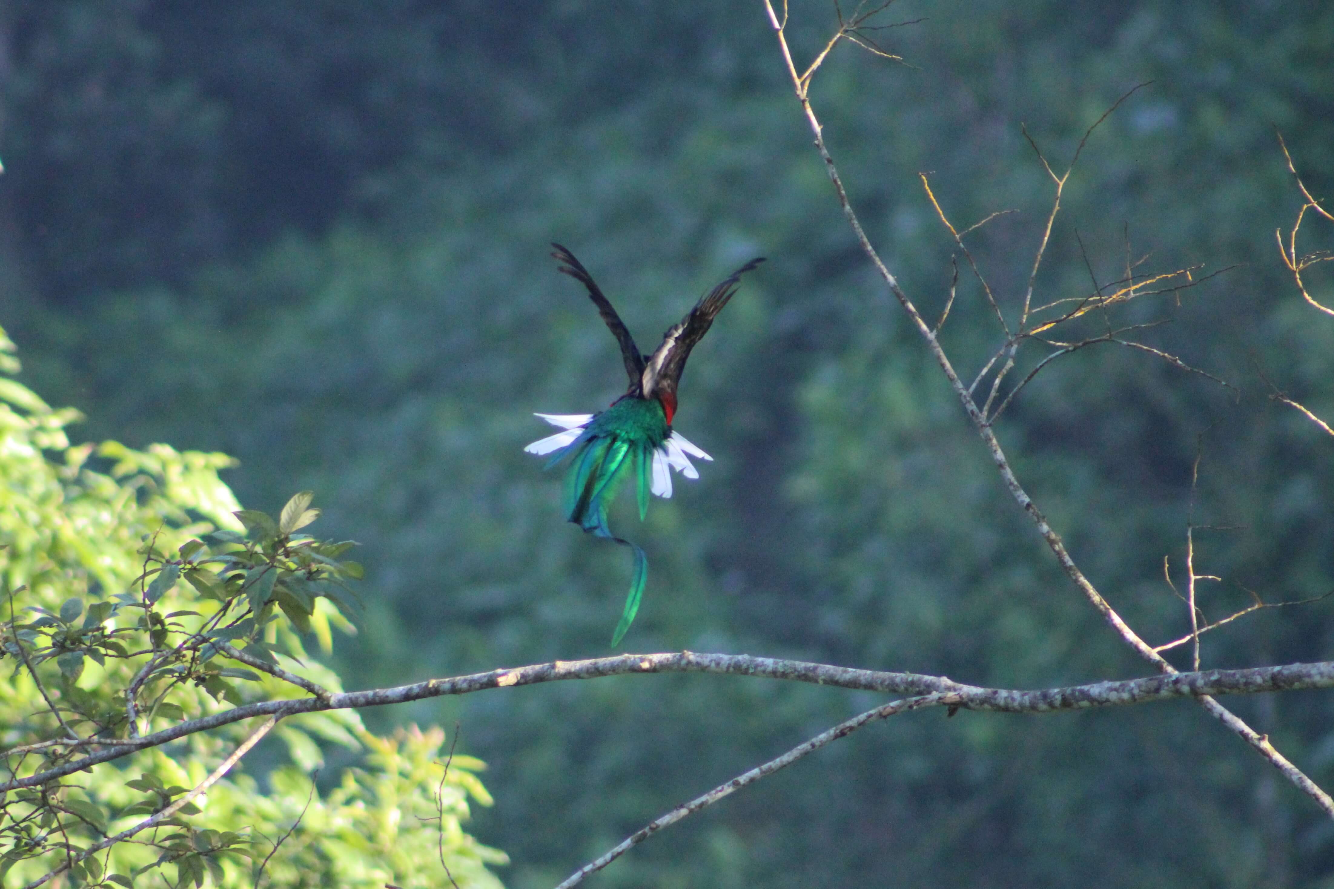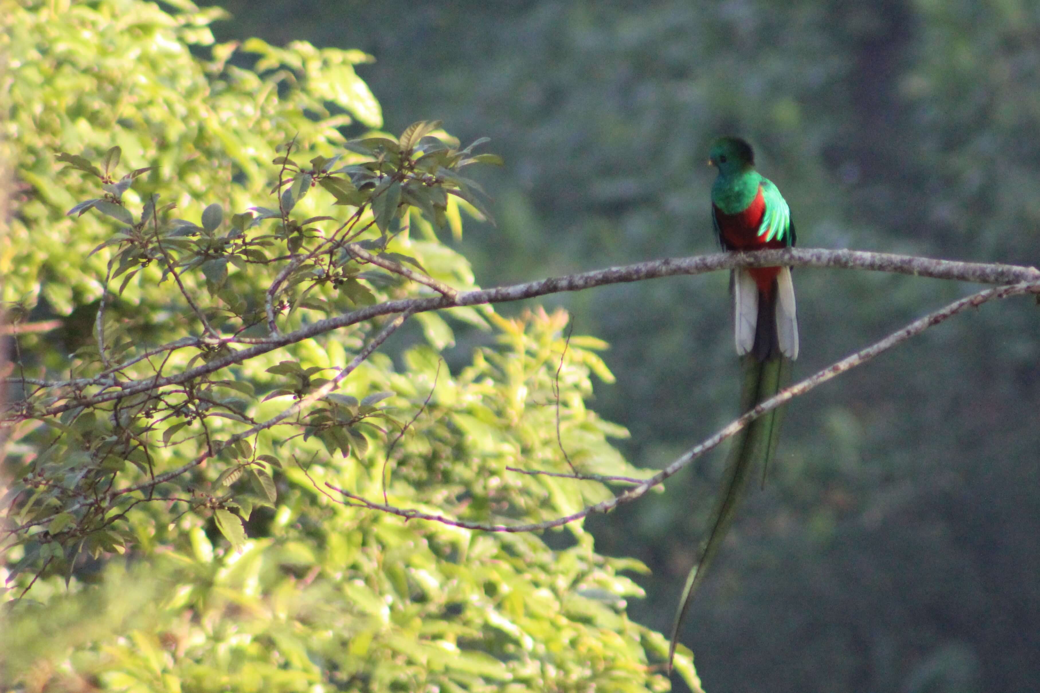Y estas son fotos originales de los quetzales que vimos. El macho es el que tiene cola más larga y plumaje abundante. La hembra no tiene tanto plumaje, pero si tiene los mismos colores: verde y rojo intensos, con algunas plumas blancas o plateadas.